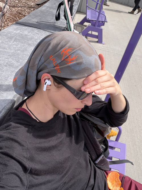 blue neck tube with real freek & cabin fever treatment. great for skiing! wear it as a sun hat! use it in a sandstorm!